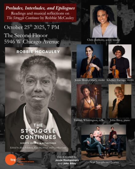 Join Jessie Montgomery and an incredible group of Chicago-based artists for an evening of storytelling, celebration and musical responses centered around the release of the new book The Struggle Continues by Jessie’s mother, playwright, director, and performer Robbie McCauley. The book encapsulates McCauley’s seminal plays, essays, and reflections centered on the Black American experience, delivered with poignancy and precision, inviting us to engage compassionately with historical and present realities in the struggle toward true liberation.
